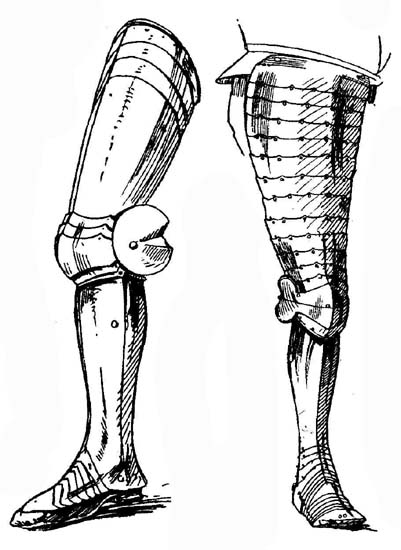 Полный ножной доспех состоит из налядвенников (нем. Diechlingen, фр. cuissards, ит. cosciali), прикрывающих бедра, наколенников (нем. Kniebuckel, фр. genouill?res, um. ginocchielli), наголенников (нем. Beinr?hren, фр. gr?ves, ит. schinieri) для защиты голени и, наконец, железных башмаков (нем. Schuhe, фр. sollerets, ит. scarpe).