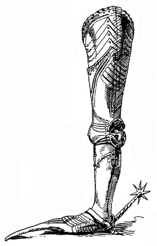 Башмаки, полностью соединенные с ножными латами, появились только во второй половине XIV века. В 1400-х годах встречались первые образцы съемных длинных носков, благодаря этому спешенный рыцарь мог [94] свободно передвигаться. Они прикреплялись поворотной заклепкой к подъему ступни, когда рыцарь уже сидел в седле. В 1430-х годах в Италии появляются башмаки с длинными (до 3-6 см) деревянными носками, обтянутые кожей и покрытые железной чешуей, которые насаживались на ногу только когда всадник сидел на коне. Длинный носок использовался приблизительно до 1490-х годов.