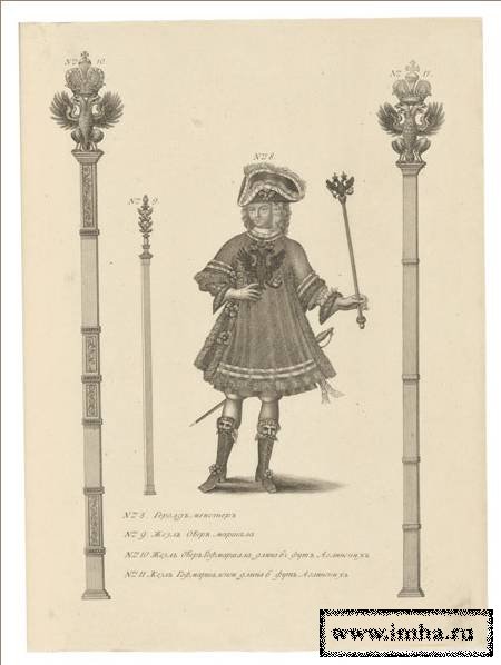 В нижней части (списком): №8. Герольдмейстеръ №9. Жезлъ Обер маршала №10 Жезлъ Оберъ гофмаршала длина 6 1/2 футъ Аглинскихъ №11 Жезлъ гофмаршальской длина 6 футъ Аглинскихъ.