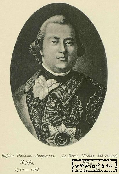Примечание. Корф, фон, Николай-Фридрих (1710—1766) — ад]ютант генерал-аншефа К. фон Бирона, барон, патрон (1746—1758) церкви св. Петра в Спб., с 1756 г. — губернатор Восточной Пруссии. С 1760 г. — генерал-полицмейстер Петербурга. камергер Петра III. С 1762 г. генерал-директор имперской полиции и сенатор.
