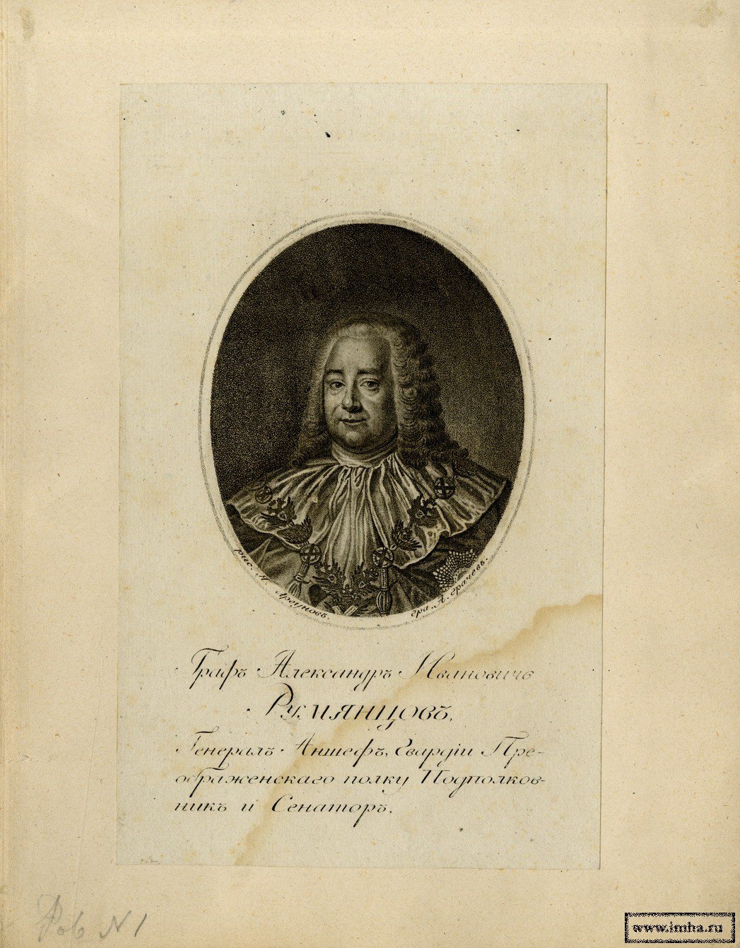 Граф Александр Иванович Румянцев - Генерал-аншеф гвардии, подполковник Преображенского полка, сенатор. А.П. Грачев по рисунку Я.И. Аргунова. Гравюра пунктиром. |