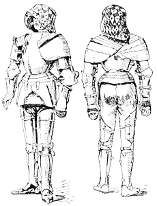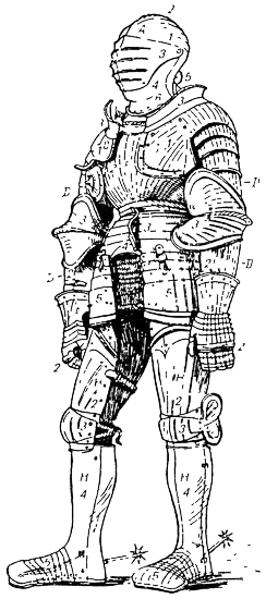 С XIII в., в стремлении надежнее защищать плечи, руки и ноги, постепенно появляются различные мелкие дополнения к кольчуге и броне в виде наплечников, наколенников, наручей, набедренников, и к середине XV в. Доспехи достигают полного развития, обратившись в сплошное стальное покрытие всего тела всадника и большей части его лошади. Наибольшим изяществом и легкостью отличались французские Доспехи времени Карла VII, веся в общей сложности всего около 1 пд.; его составляли шлем с неподвижным забралом для верхней части лица; нижняя часть была закрыта предличником, привинченным к нагрудным латам; наплечники и налокотники защищали руки; набрюшник и набедренники, в виде черепицы, покрывали живот и бедра; кроме того, боковики, крестцовое прикрытие, а также налядвенники и наколенники покрывали всю среднюю часть тела, а поножи и остроконечная чешуйчатая обувь – ноги. Руки защищались латными рукавицами.