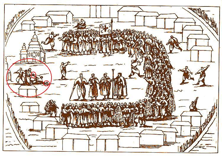 [29] Так, в сочинении малороссийского историка П.А. Кулиша "Чорная Рада" (Спбг, 1860), следующим образом описывает "прощание козака со светом" (т.е. уход в монастырь): "Музыка ударяла "веселоi" и компания трогалась в путь. Впереди всех на прекрасном боевом коне несся сам прощальник "сивоусий"; нередко и он сам сходил с коня, пил, ел и пускался "навприсядки". Всех встречных и поперечных он приглашал в свою компанию, угощал напитками и предлагал всевозможные закуски. Если он увидит на своем пути воз с горшками, немедленно подскакивает к нему, опрокидывает его …, и вся веселая компания его тотчас подбегает к горшкам, пляшет по ним и разбивает вдребезги. Если он завидит воз с рыбой, также подскакивает к нему и …всю рыбу разбрасывает по площади и приговаривает: "Iжте, люди добрi, та поминайте прощальника!". Если он наскочит на "перекупку" с бубликами, то …забирает у нее все бублики и раздает их веселой компании. Если попадется ему лавка с дегтем, он…скачет в бочку с дегтем, танцует в ней и выкидывает всевозможные "выкрутасы". За всякий убыток…платит потерпевшим червонцами, разбрасывая их вокруг себя "жменями". Так добирается прощальник…до самого монастыря; тут компания его останавливается у стен святой обители, а сам он кланяется собравшемуся народу на все четыре стороны, просит у всех прощения, братски обнимается с каждым и, наконец, подходит к воротам монастыря и стучит в них: