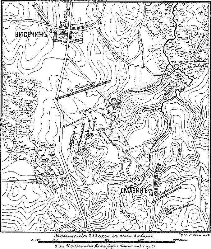6-го августа главныя силы Миниха подошли къ Черновицамъ, имея назади обозъ подъ прикрытіемъ 20 тыс. Шипова. (Схема № 14). Къ югу отъ единственной дороги на Окопъ-Ракитню не было путей (нетъ и въ настоящее время), но было известно, что лесистыя горы этой местности нельзя считать непроходимыми (Схема № 14 составлена по журналу военныхъ действій (см. II в. нашихъ матеріаловъ) и по позднейшему плану (XIX стол.) окрестностей Черновицъ. Современный планъ съ указаніемъ пути следованія Миниха выраженъ на схемъ № 16; а планъ позднейшаго времени, которымъ мы пользовались, на № 17.). (современныя горы Москова и Доброва).Турки,весьма вероятно опасаясь обхода по этимъ тропамъ, совершенно неожиданно очистили "Окопъ" ("Шанецъ"), окончательно испортили дорогу на Ракитню и скрылись въ лесахъ.