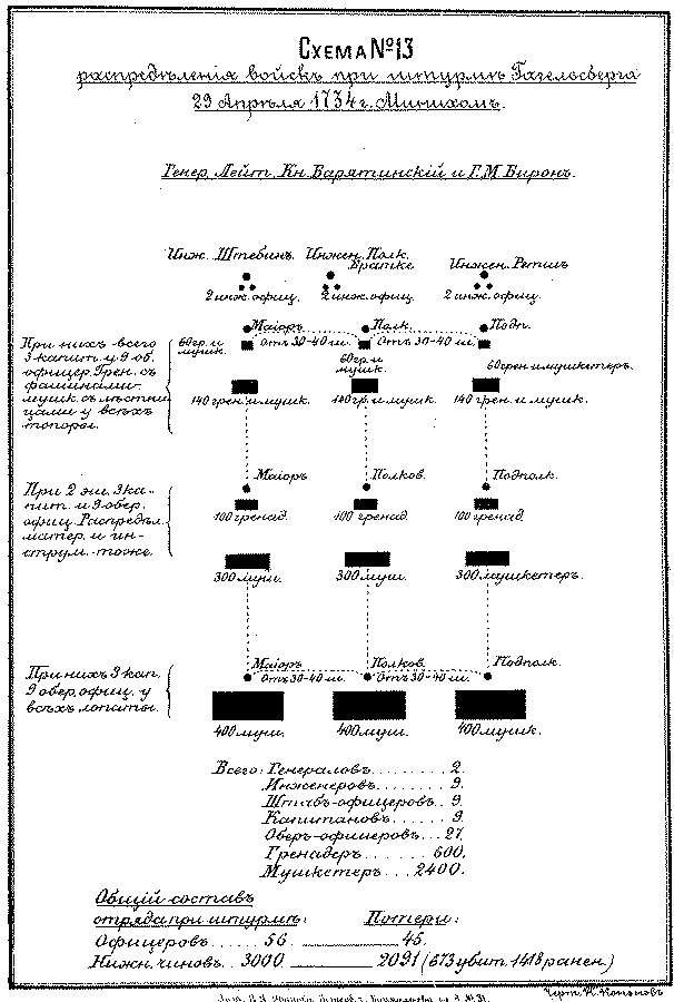 Артиллерія полевая съ полковыми пуш. не менее 150 орудій. Осадный паркъ, не считая мортирцевъ, – 24 орудія *).