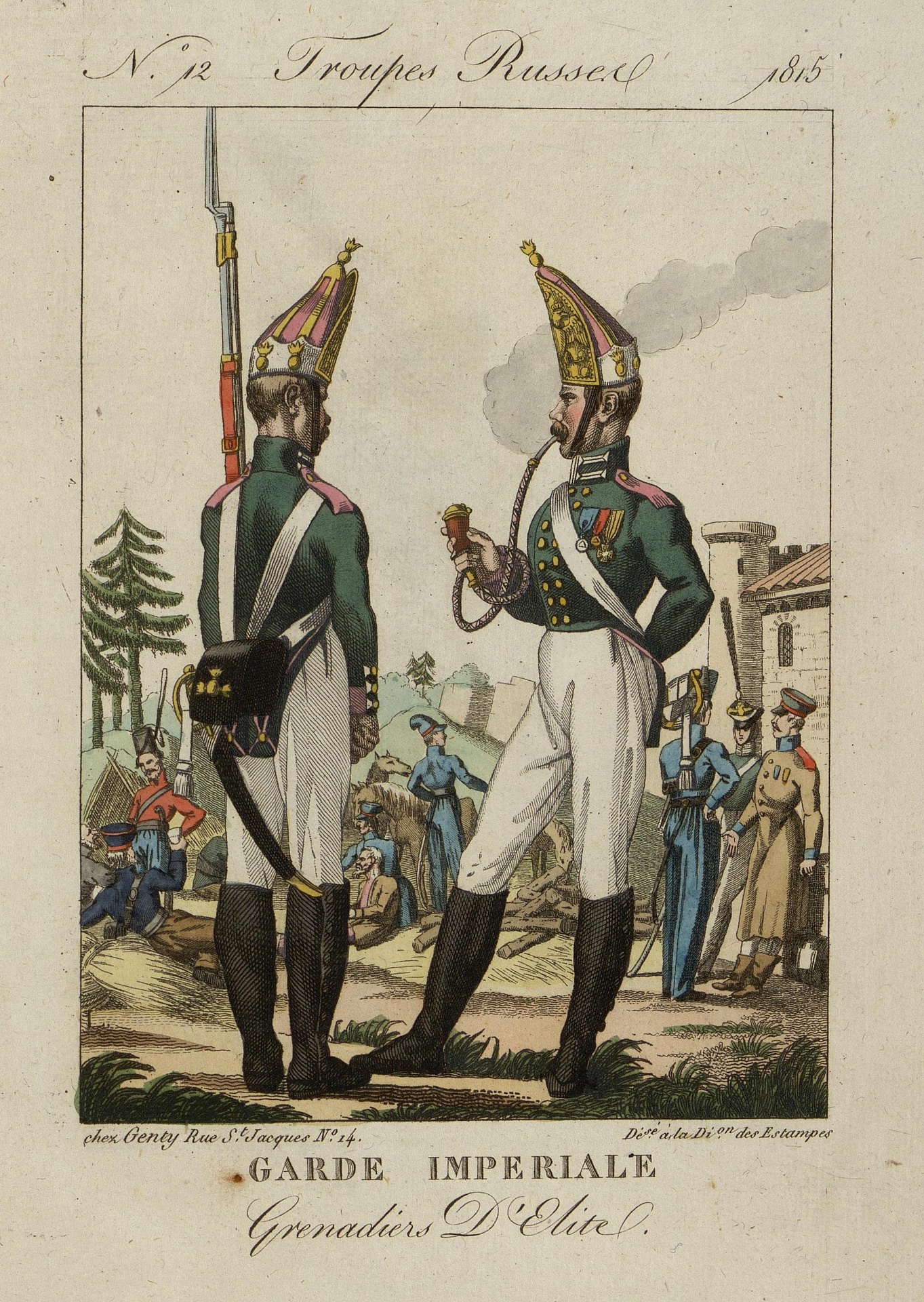 Автор рисунков: Мартине, Пьер. 1781-1815 (?). Неизвестный гравер, перв. четв. XIX в. Франция, Париж, 1815 г. Издательство "Genty". Альбом раскрашенных гравюр "1-re Suite Costumes militaires Infanterie Russe.". Бумага, резец, офорт, акварель. 27,5х20,2 см. ГЭ. |