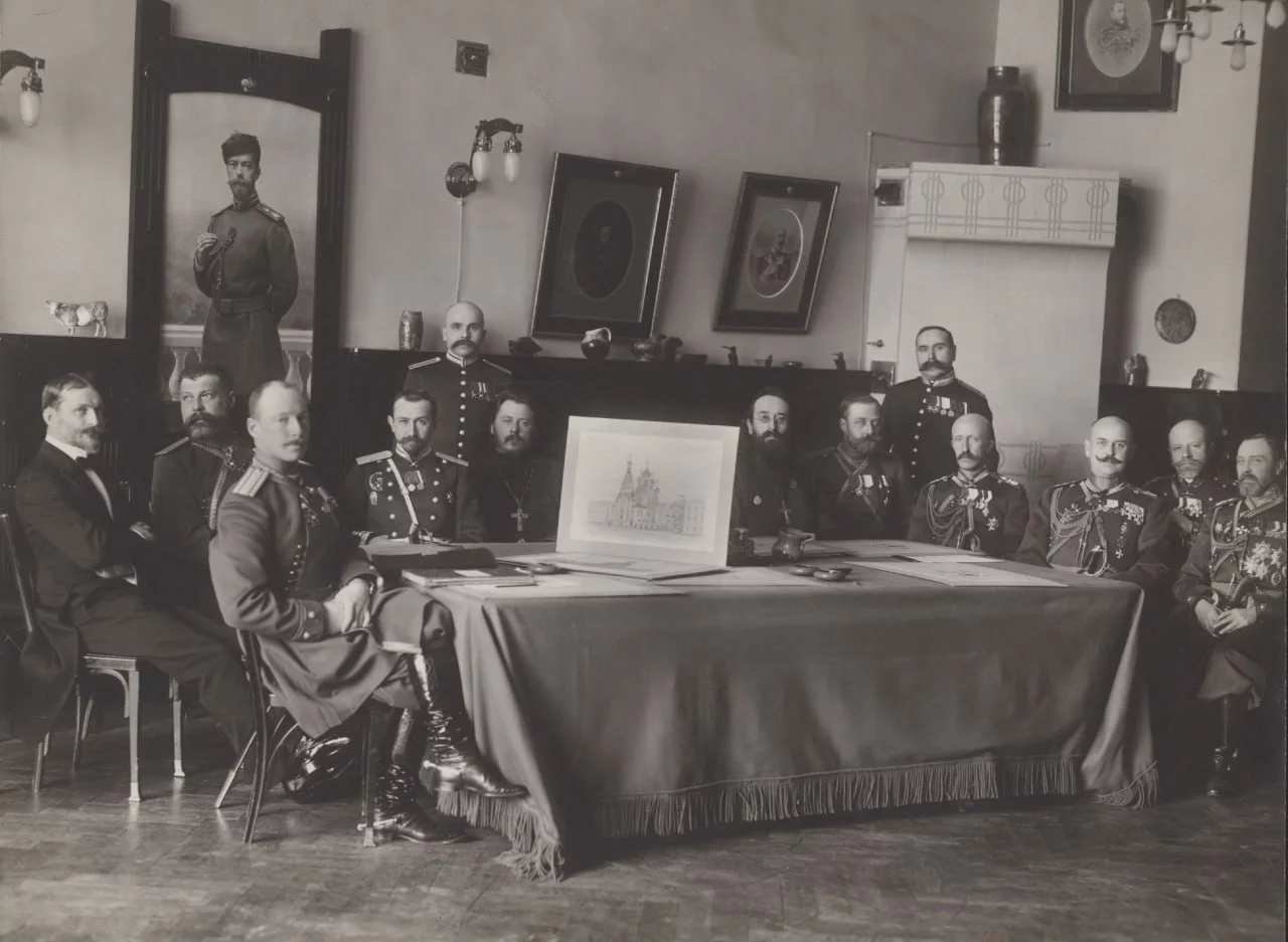 1910-е. Утверждение плана полковой церкви лейб-гвардии 4-го Стрелкового императорской фамилии полка, выполненного архитектором Е. Константиновичем.