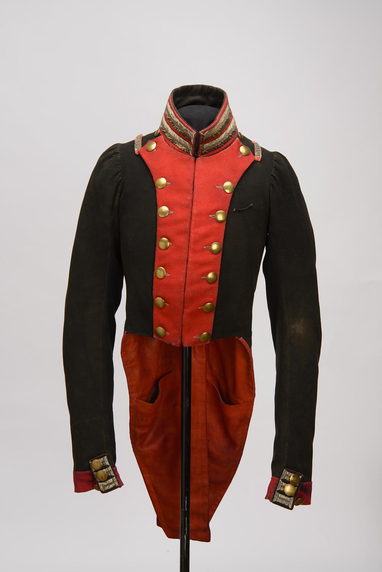 | Мундир офицерский лейб-гвардии Литовского полка. Россия. 1812-1817 гг. Сукно, стамед, полотно, холст, металлическая нить, медь. Шитье, золочение Спинка 97 см; талия 85 см |
