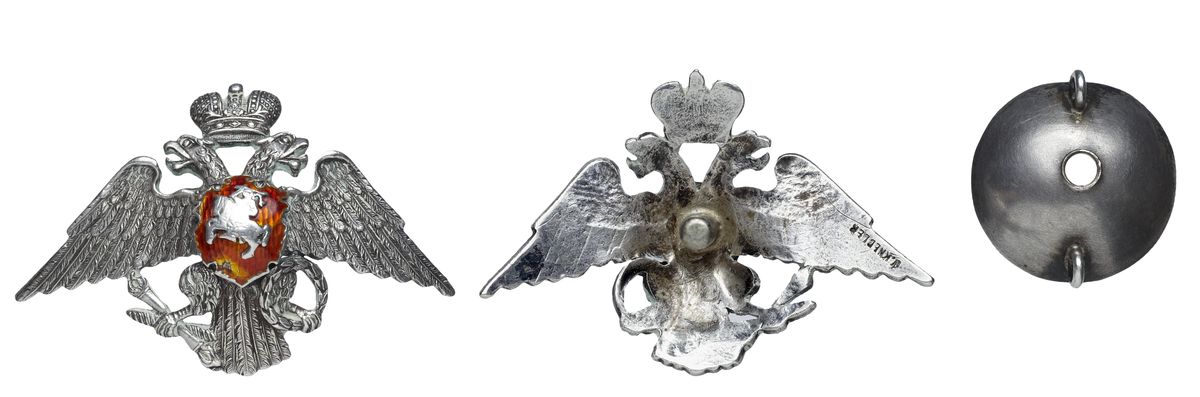 Серебряный двуглавый орел, увенчанный серебряной Императорской короной, выполненный по рисунку орла со знамени, пожалованного полку за сражение под Бородино. На груди орла золотой фигурный щиток, покрытый эмалью красного цвета. На нем серебряная фигура так называемого Литовского всадника. Badge of the Life-Guards Litovsky RegimentSilver double-headed eagle beneath the silver Imperial crown after the image of the eagle on the banner which was carried by the regiment at the Battle of Borodino. On the breast of the eagle is a small gold figurative shield covered with red enamel. On it is the silver figure of the so-called Lithuanian horseman. На фото: Знак Лейб-Гвардии Литовского полка. Мастерская Яна Кнедлера, Варшава, 1910-1917 гг. Серебро, эмаль. Вес 19,79 гр. Размер 52х35 мм. Клеймо на оборотной стороне знака фирмы именное «J. Knedler». |