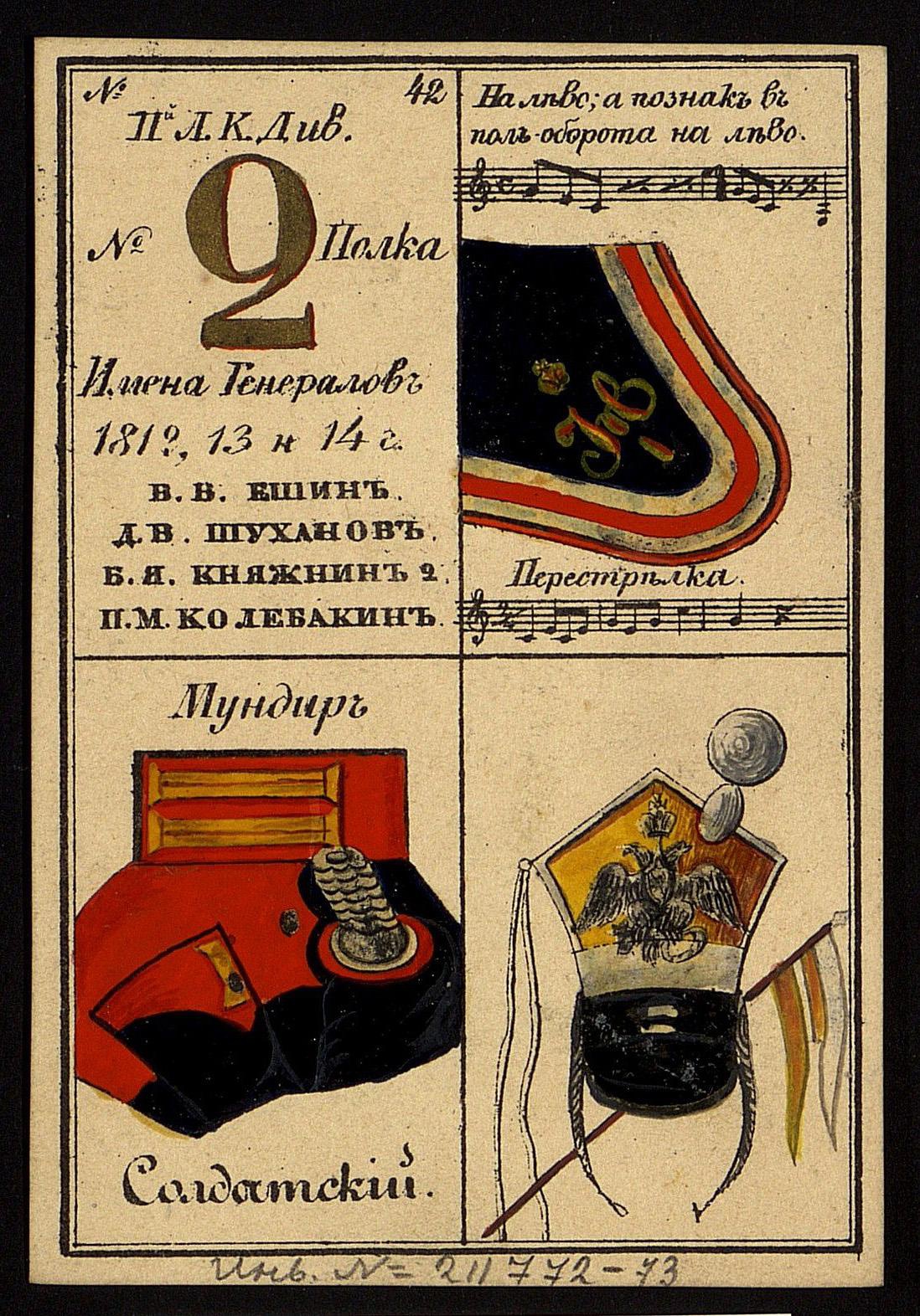 Примечание. На основании прежних правил о старшинстве полк праздновал 200-летний юбилей 27 Июня 1851 г., причем полку была пожалована Андреевская юбилейная лента. Согласно приказа по Военному Ведомству 1834 г. № 24 лента эта должна храниться в полку, но в строй не выносится.
