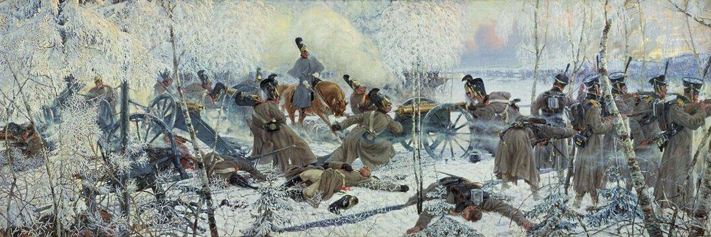Гвардейская конная артиллерия обстреливает французские колонны во время отступления наполеоновской армии. КАРЯГИН Петр Павлович. 1912. Холст, масло. Артиллерийский музей, Санкт-Петербург.