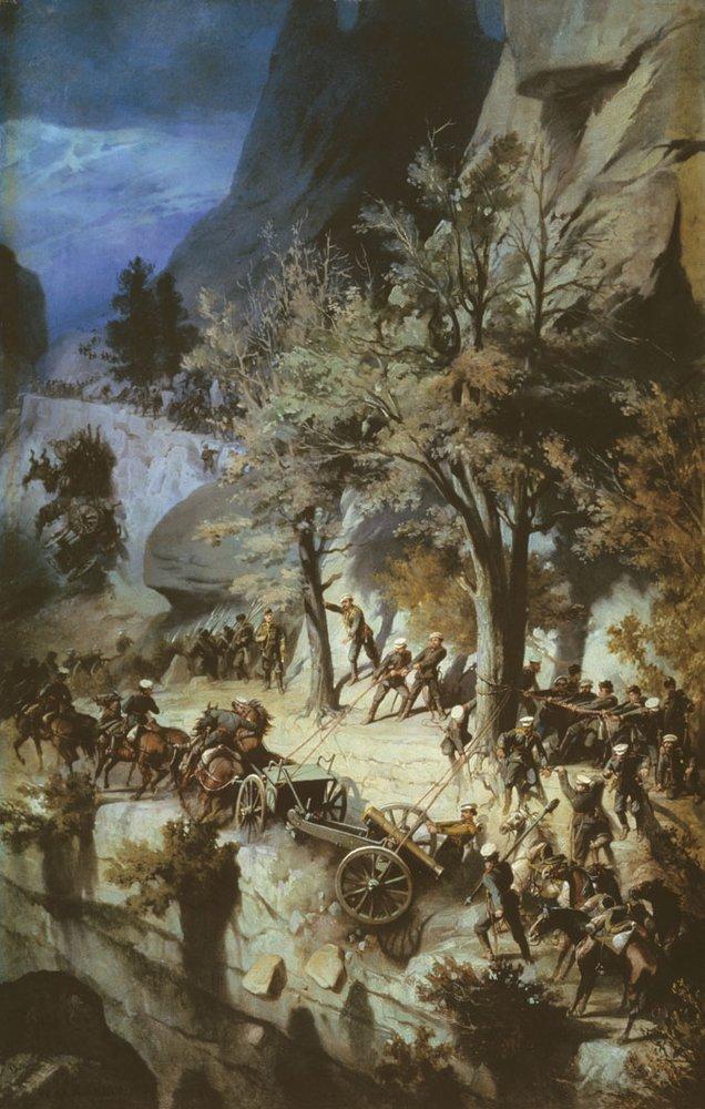 Переход лейб-гвардии 6-й Донской батареи через Балканы. 1877 год. ШАРЛЕМАНЬ (Боде-Шарлемань) Адольф Иосифович. 1879. Холст, масло. Артиллерийский музей, Санкт-Петербург.
