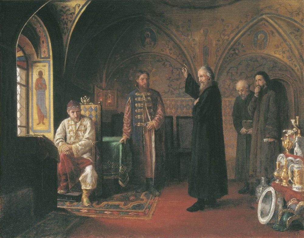 | Митрополит Филипп и Иоанн Грозный. | ТУРЛЫГИН Яков Прокопьевич. Холст, масло. Омский областной музей изобразительных искусств им. М. А. Врубеля, Омск. | |