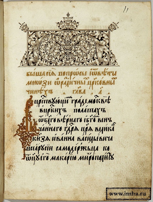 Быша сии вопроси и ответы мнози о различных церковных чинех, в царствующем граде Москве в царских полатах, от благоверного и боговенчаннаго царя и государя и великого князя Ивана Васильевича всеа Русии самодержца к отцу его Макарию митрополиту всеа Русии, и ко всему священному собору, в осмоенадесять лето царства его, в двадесять же первое лето от рожества его, при его отце Макарии митрополите всеа Русии, в девятое лето святительства его, и всего священного собора архиепископов и епископов руския митрополия самобывших тут: Феодосия, архиепископа великого Новаграда и Пскова; Никандра, архиепископа ростовского и ярославского; Трифона, епископа суздальского и Торуского; Гурия, епископа смоленского и брянского; Касьяна, епископа рязанского и муромского; Акакия, епископа тверского и кашинского; Феодосия, епископа коломенского и коширского; Савы, епископа сарского и подонского; Киприяна, епископа пермского и вологоцкого, с честными архимариты и игумены и весь священный собор о многих и различных церковных чинех и исправлении, и о трегубой аллилуйи, и о монастырских чинех, и о общем предательном житии, и о пьянственом питии, и о прочих священных чинех, и о святительском суде, и вперед святителем у себя детей своих и племянников не держати, також по всем честным монастырем общим и особь сущим архимаритом и игуменом детей своих и племянников у себя в монастыре не держати, и о прочих священных чинех по преданию святых апостол и святых отец, и по священным правилом, и по божественому уставу, ничтоже претворяюще, и о вдовствующих попех и дъяконех, по преж нас уложенному собору отеческому, и по учению, и по наказанию, цже во святых отца нашего Петра митрополита киевского и всеа Русии нового чудотворца, и по написанию святейшаго Фотия митрополита киевского и все Русии, и по собранию и по написанию от священных правил апостольских и отеческих, преподобного игумена Иосифа Дамского волока, самобывшаго на том прежнем соборе, о вдовствующих попех и дияконех, что им в миру живущим не служити».