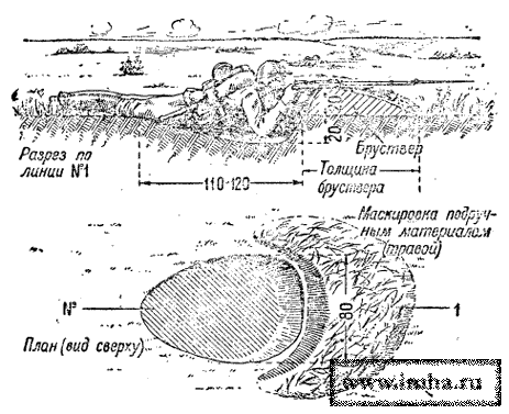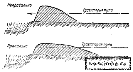 При устройстве бруствера не следует насыпать его крутой горкой, а надо стараться сделать возможно положе. Пологий бруствер толще и ниже, а, следовательно, не так легко может быть пробит пулей или осколком снаряда и менее заметен противнику.