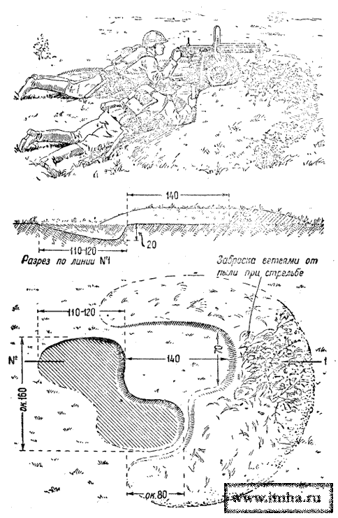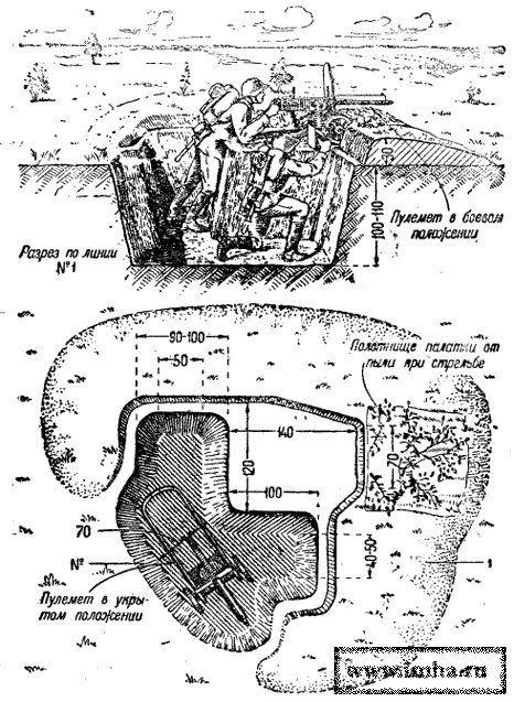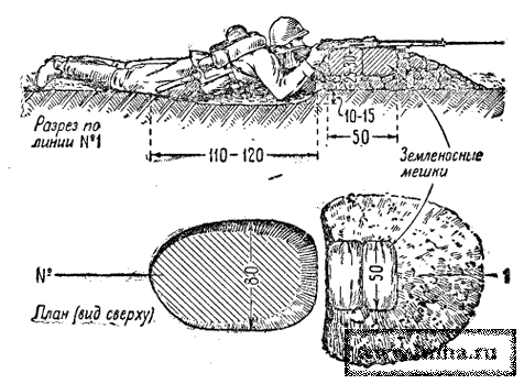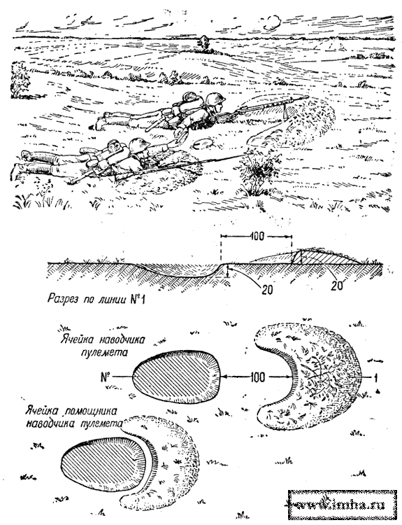 Пулеметная ячейка для ведения огня лежа делается таких размеров, чтобы в ней могли поместиться и удобно работать у пулемета два бойца - наводчик и его помощник. Землю при отрывке ячейки наводчик выбрасывает не непосредственно перед собой, а несколько вперед, оставляя площадку для установки пулемета. Длина этой площадки для ручного пулемета на сошках 100 см, для станкового пулемета на катках - 140 см. Ширина площадок оставляется такой, чтобы удобно было установить пулемет и стрелять из него в нужном направлении. Помощник наводчика станкового пулемета располагается в ячейке справа и несколько впереди так, чтобы ему было удобно подавать ленту в пулемет. Помощник наводчика ручного пулемета отрывает себе ячейку справа и сзади наводчика, на таком расстоянии от наводчика, чтобы удобно было передавать ему диск с патронами. Он может расположиться и рядом с наводчиком, в особенности тогда, когда предполагается дальнейшее развитие ячеек (для стрельбы с колена, стоя).