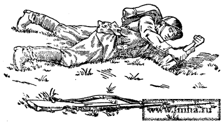 Бруствер насыпается на 30 см от края ячейки, чтобы наводчику удобно было поставить локти при стрельбе, а помощнику положить на берму подсумок с патронами. В месте, где находятся сошки ружья, земля бруствера уплотняется не сильно, чтобы в случае перемены позиции сошки можно было легко выдернуть из земли. Для маскировки длинного ствола противотанкового ружья позиция для него избирается преимущественно среди кустов, поросли, и в бруствер втыкаются ветки. Командир расчета в 3-5 м справа или слева от ружья отрывает себе обычную ячейку. Приемы отрывки ячейки для ведения огня лежа. Какие же приемы должен применять боец, чтобы, находясь под огнем, быстро и правильно отрыть себе отдельную ячейку для стрельбы лежа? Для этого необходимо поступать следующим образом. Перебежав на место, удобное для ведения огня, боец, чтобы не забросать винтовку (автомат) землей, кладет ее вправо от себя на расстояние вытянутой руки, штыком к противнику.