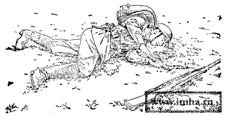 В бою с германскими фашистами может случиться, что придется окапываться на местности, зараженной отравляющими веществами (ОВ). Тогда надо поступать следующим образом. Если придется окапываться лежа, то боец, чтобы предохранить себя от заражения, сначала должен подложить под себя защитную накидку или мат, заблаговременно сплетенный из соломы, веток, камыша, прутьев, а в крайнем случае использовать для этого шинель или полотнище палатки. Винтовку (автомат) он при этом не откладывает в сторону, а кладет на подстилку. Лежа на накидке или мате, боец сначала снимает со всей площади отрываемой ячейки верхний слой земли толщиной не менее 10 см и отбрасывает его в подветренную от себя сторону. Затем он ложится на обнаженную (обезвреженную) землю и продолжает окапываться так, как это было рассказано выше. В случае заражения рук боец дегазирует их (а также черенок лопаты) с помощью индивидуального противохимического пакета.
