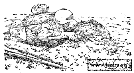 Во время работы боец не прекращает наблюдения за противником и, если надо, даже из неоконченной ячейки ведет огонь, используя насыпанную землю и куски дерна как упор для винтовки (автомата).
