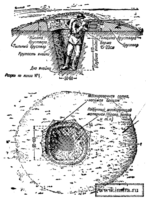 Стрелковые, пулеметные и минометные ячейки, отрытые для стрельбы стоя, наилучшим образом предохраняют бойца как от настильного ружейно-пулеметного огня, так и от огня минометов, артиллерии, авиации и при атаке неприятельских танков. Мало вероятно, чтобы снаряд, мина или авиабомба попали в небольшую по размерам ячейку для стрельбы стоя, а разрыв рядом с ячейкой не опасен для бойца. К тому же в глубокой ячейке бойцу легко укрыться от пулеметного огня с самолетов, а также вести борьбу с танками, подбрасывая противотанковые гранаты под гусеницы или кидая зажигательные бутылки. Поэтому, когда будет на то приказание, боец должен стремиться как можно скорее отрыть себе ячейку для стрельбы стоя.