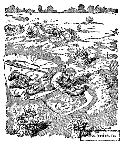Точно таким же способом окапываются лежа пулеметчики и минометчики. Земля из ячеек отбрасывается с таким расчетом, чтобы впереди получилась необходимых размеров площадка для пулемета или миномета.