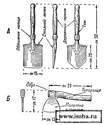 Боец обязан знать размеры малой и саперной лопат, чтобы пользоваться инструментом как подручной меркой при работах. Округленные размеры инструмента даны на рисунках в сантиметрах. Вес малой лопаты - около 1 кг.