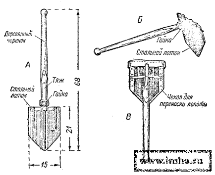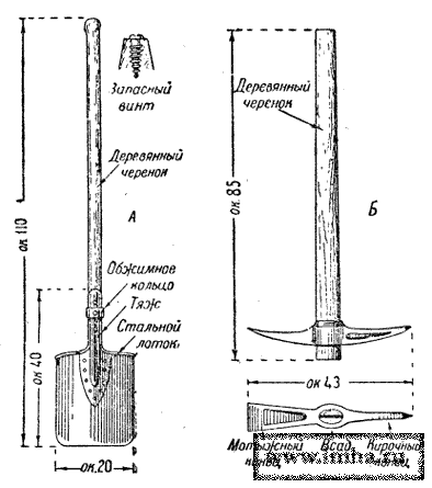 А - саперная лопата (запасной винт помещен на конце черенка лопаты); Б - киркомотыга