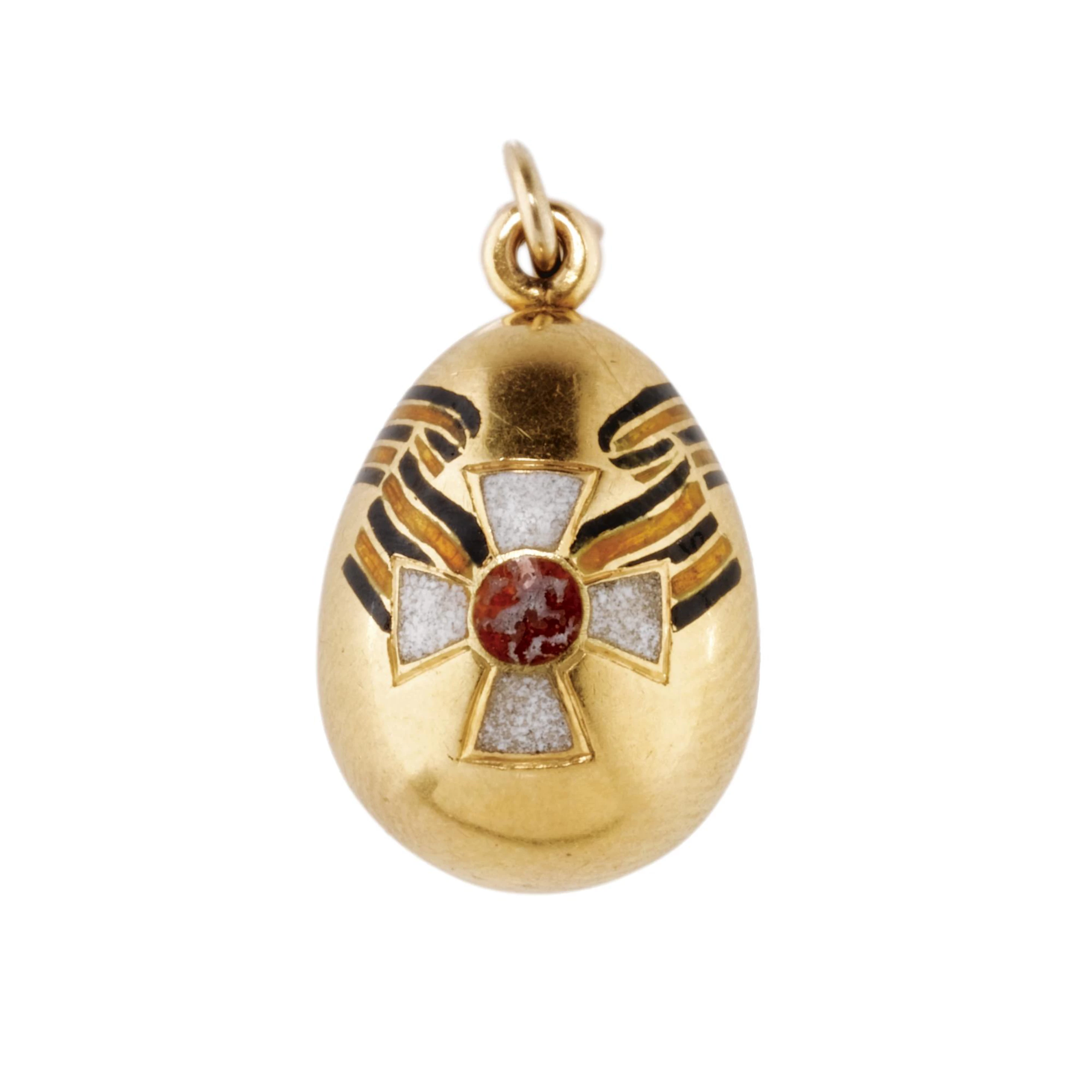 Корпус украшен полихромной эмблемой ордена, перевязанной орденской лентой, удерживающей крест, в окружении лиственных ветвей. Крышка куполообразная, с гирляндами цветов и стилизованными золотыми гадронами. Ручка выполнена в виде цветка. На нижней стороне изделия — синяя фабричная марка. Высота с крышкой: 11 см.