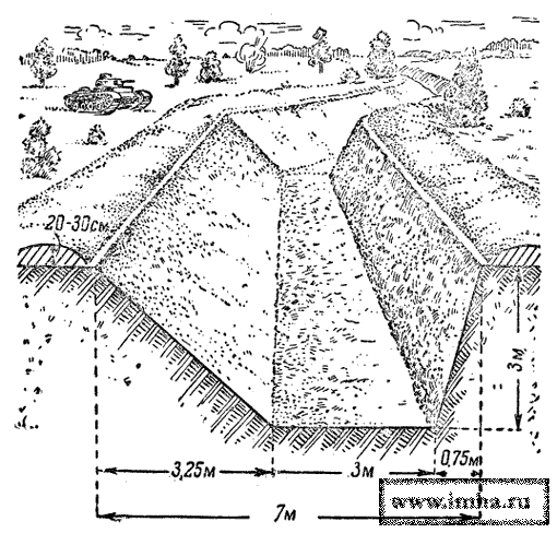 Противотанковый ров обычной формы. Из книги С. Е. Гербановского, "Фортификация пехоты", Москва, 1942 |