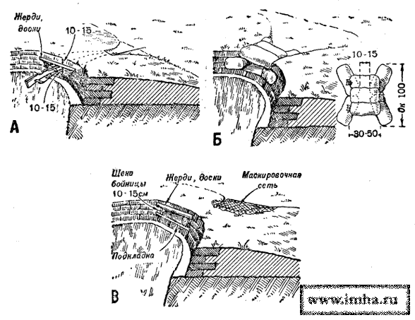 При устройстве покрытых бойниц надо следить, чтобы насыпь над бойницей не образовывала заметного бугорка. Для этого бойницу понижают, насколько позволяет обстрел из нее, а насыпь разравнивают. Особенно тщательно нужно маскировать отверстие бойницы, иначе оно будет видно издали и станет мишенью для снайпера противника. Маскируют бойницы спереди маскировочной сетью (рис. 43, В) или устройством поднимающейся дощатой ставни, прикрывающей наружное отверстие бойницы. Ставня открывается с помощью палки, на конце которой приделана дощатая планка (рис. 46).