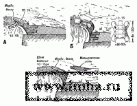 Одетые ниши устраивают следующим способом. Временно собрав раму, как показано на рис. 50, прислоняют ее к земляной крутости и очерчивают то место, которое займет рама. Убрав раму, на очерченном месте выбирают малой лопатой грунт на ширину доски (18-23 см). На выровненное дно углубления кладут горизонтально нижнюю доску (лежень), затем вставляют в лежень одну из боковых досок (стойку), кладут на нее верхнюю доску (перекладину), подставляют другую стойку и заводят нижний конец этой стойки до соединения его с лежнем (рис. 51, А). Доски рамы соединяют между собой в полдоски или шипом.