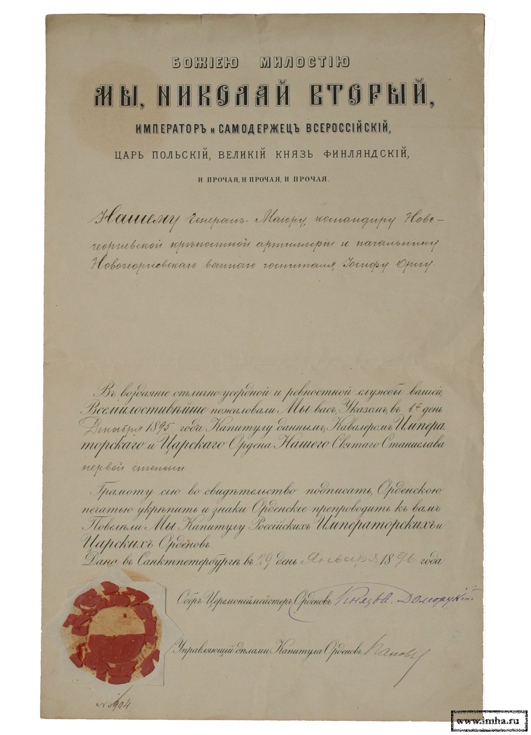Наградной документ о пожаловании ордена Св. Станислава 1-й степени генерал-майору, командиру Новогеоргиевской крепостной артиллерии и начальнику Новогеоргиевского военного госпиталя Иосифу Орлу, указом от 6.12.1895 г. Дан 29.01.1896 г. Под номером 5904. Остатки сургучной гербовой печати. Бумага, краска, чернила. Размер 35,4х22,1 см. [За подписью обер-церемониймейстера Высочайшего Двора, будущего члена Государственного совета князя Алексея Сергеевич Долгорукого (?-1915), сына князя С.Н. Долгорукого.] |