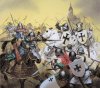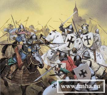 Что же касается национального состава войска, приведенного под Танненберг польским королем Владиславом Ягелло (окрещенным незадолго перед тем литовским князем Ягайлой – смертельным врагом Московской Руси, лишь "чуть-чуть" запоздавшим прийти на помощь Мамаю на Куликовом поле!) и его "заклятым другом" и кузеном Великим князем Литовским Витовтом (у которого братец Ягайло укокошил родного батюшку Кейстута, так что сам Витовт с величайшим трудом сумел вырваться из "братского" плена и сбежать под защиту Тевтонского Ордена, переодевшись в женское платье; служанку, обменявшуюся с ним одеждой, незамедлительно предали сожженью на костре!), то это якобы "славянское" войско в действительности состояло из представителей чертовой дюжины разных народностей – литовцев, жмудинов, армян, караимов, валахов, татар, молдаван-бессарабов, венгров, кашубов и многих других – хотя были, конечно, в его составе и славяне – поляки, воины из западнорусских земель и отряды моравских, силезских и чешских наемников (в числе последних - будущий гуситский полководец Ян Жижка из Трокнова – грозный вождь еретиков-таборитов, велевший после смерти содрать с себя кожу на барабан, под грохот которого табориты шли в бой против воинов Креста). Армянские наемники (как пехотинцы, так и конники) в описываемую пору ценились весьма высоко – недаром ордынская армия Мамая в битве на Куликовом поле в 1380 г. включала в свой состав "арменские" наемные отряды!. Караимов (иудеев тюркского происхождения, признававших Тору, но отрицавших Талмуд) князь Витовт привел из своего крымского похода и поселил в Тракае (Троках); с тех пор караимы составляли нечто вроде лейб-гвардии литовского Великого князя. Татарская конница Витовта (3000 сабель) под предводительством хана Джелал-эд-Дина представляла собой внушительную военную силу, а отнюдь не "вспомогательные части», как утверждали советские историки, позволявшие себе говорить о "малонадежной татарской коннице" (и это в начале XV века, всего пару лет после сокрушительного разгрома гигантской армии Витовта – в которую, между прочим, тогда входил и контингент войск Тевтонского Ордена! – этими же самыми "малонадежными татарскими конниками" в битве на Ворскле в 1399 г.)! Кстати, с татарами у тевтонских рыцарей были давние счеты - со времен битвы с ордой темников хана Батыя при Лигнице (Легнице, Вальштатте) в Силезии в 1241 г. (см. илл. в начале данной миниатюры), после которой к вечеру в ордынскую ставку были доставлены 9 мешков окровавленных рыцарских ушей, отрезанных победоносными монголо-татарами у убитых витязей силезского герцога Генриха (тевтонских рыцарей, тамплиеров, иоаннитов, поляков и силезцев). У нас о битве под Лигницей, обескровившей татарское войско, ослабившей наступательный порыв темников хана Батыя и заставившей их, в конечном счете, повернуть назад, мало что известно. Между тем, в Германии (да и в Польше) она извенстна как одно из решающих сражений, решивших не только судьбу обеих стран, но и всей Европы (если не сказать - всего Христианского мира)!