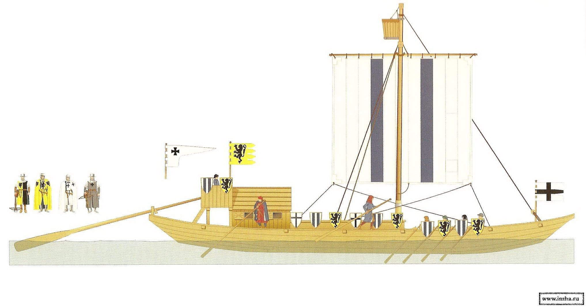 Расположенные вдоль речных путей на орденской территории города были обязаны, наряду с пешим и конным ополчением, предоставлять в распоряжение Тевтонского ордену также лодки, корабли и матросов, а расположенные вдоль речных путей деревни - гребцов. В "Военной книге" города Эльбинга за 1383-1409 гг. в этой связи упоминаются: