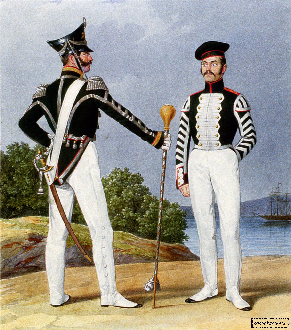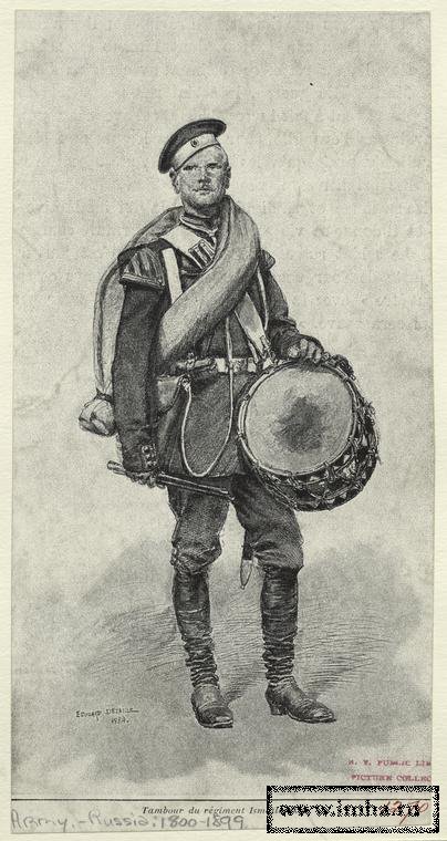 Барабанщики отличаются от строевых рядовых особыми наплечниками из приборного сукна, расшитыми белою или желтою тесьмою.