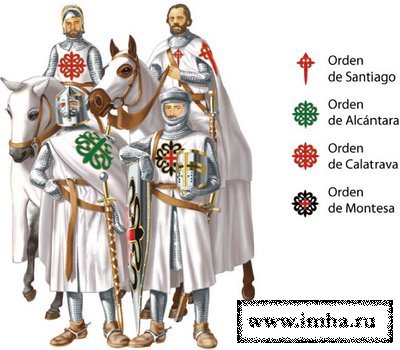 В 1143 г. на территории Иберийского полуострова (в Каталонии) появились рыцари Ордена госпитальеров (иоаннитов). Через три года, в 1146 г. в Испанию прибыли первые "бедные рыцари Христа и Храма Соломонова" (храмовники-тамплиеры). В 1219 г., после вступления принцессы из римско-германского императорского дома Гогенштауфенов в брак с королем Кастильским доном Фернандо (Фердинандом) III, три замка в Испании были переданы духовно-рыцарскому Тевтонскому (Немецкому) Ордену Пресвятой Девы Марии. Кроме того, тевтонские рыцари получили от короля Кастилии значительные земельные владения к северо-востоку от древней столицы вестготских королей Испании - Толедо, в обмен на обязательство вести "священную войну" против арабов-мусульман (которых на Иберийском полуострове, в отличие от Святой Земли, называли не "сарацинами", а "маврами").![]()