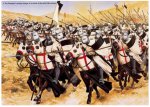 Лишь много лет спустя, по мере постепенного появления у "пилигримов" из разных стран Европы зачатков национального самосознания, матерчатые кресты на их одеждах и знаменах стали принимать различную окраску. В то же время красный крест продолжал служить общим символом всех крестоносцев, готовых пролить кровь ради освобождения Святой Земли от гнёта иноверцев. А тамплиеры служили как бы образцом, или, выражаясь современным языком, "архетипом" этого "нового рыцарства". Поэтому общие для всех крестоносцев красные кресты украшали их одеяния, щиты и флажки на пиках.