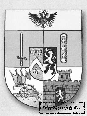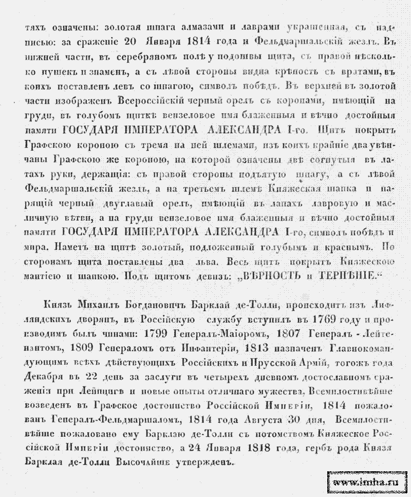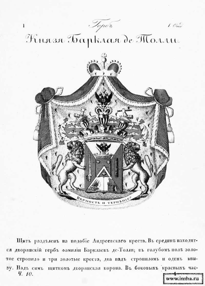 Герб князей Барклай де Толли. Щит четырехчастный, разделенный диагоналями. В верхней части, в золотом поле, российский двуглавый орел, имеющий на груди щиток с вензелем Императора Александра I. B правой части, в красном поле, шпага золотая с алмазами и лаврами, и на клинке надпись: "За 20 Генваря 1814 года». В левой части, в красном поле, фельдмаршальский жезл. В нижней части, в серебряном поле, справа несколько пушек и знамен, а слева крепость, во вратах коей стоит лев со шпагою в правой лапе. Посредине герба щиток с дворянским гербом фамилии Барклай де Толли; на гербе графская корона и на ней три дворянских шлема; на правом шлеме корона графская, и на ней согбенная рука в латах, держащая поднятую шпагу; на среднем шлеме российско-княжеская шапка, и над нею российский двуглавый орел, имеющий на груди вензель Императора Александра I, и в лапах ветви: лавровую и масличную. На левом шлеме корона графская, и над нею согбенная рука в латах держит фельдмаршальский жезл. Щито-держатели два льва. Девиз: "Верность и терпение». Щит покрыт княжескою мантией и увенчан российско-княжескою шапкою. Герб князя Барклая-де-Толли внесен в "Общий Гербовник», часть X, под № 1. |