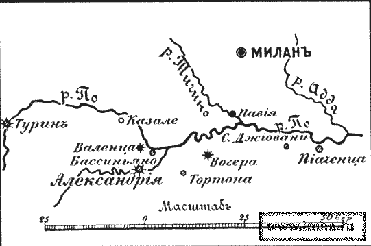 После поражения на р. Адде Моро отступил за р. Тичино. Имея двоякую за дачу—прикрывать Турин и поддерживать со общения с войсками Макдональда, находившимися в Неаполе, — Моро одну часть своих войск направил к Турину, а с другою расположился, в ожидании прибытия Макдональда, на весьма сильной позиции между крепостями Валенцою и Александрией за рр. По и Танаро. В это время Суворов, заняв Милан, получил известие, оказавшееся впоследствии неверным, о приближении армии Макдональда, а потому направился с главными силами к переправам р. По, и 26 апреля союзные войска стояли уже на обоих берегах. Одновременно с этим получилось и другое известие об оставлении французскими войсками Валенцы. На основании этого фельдмаршал приказал Розенбергу послать 27 апреля от его колонны авангард генерал-майора Чубарова (около 3 тыс. чел.), для занятия этого города.