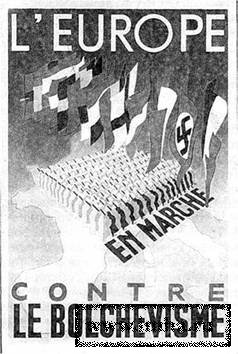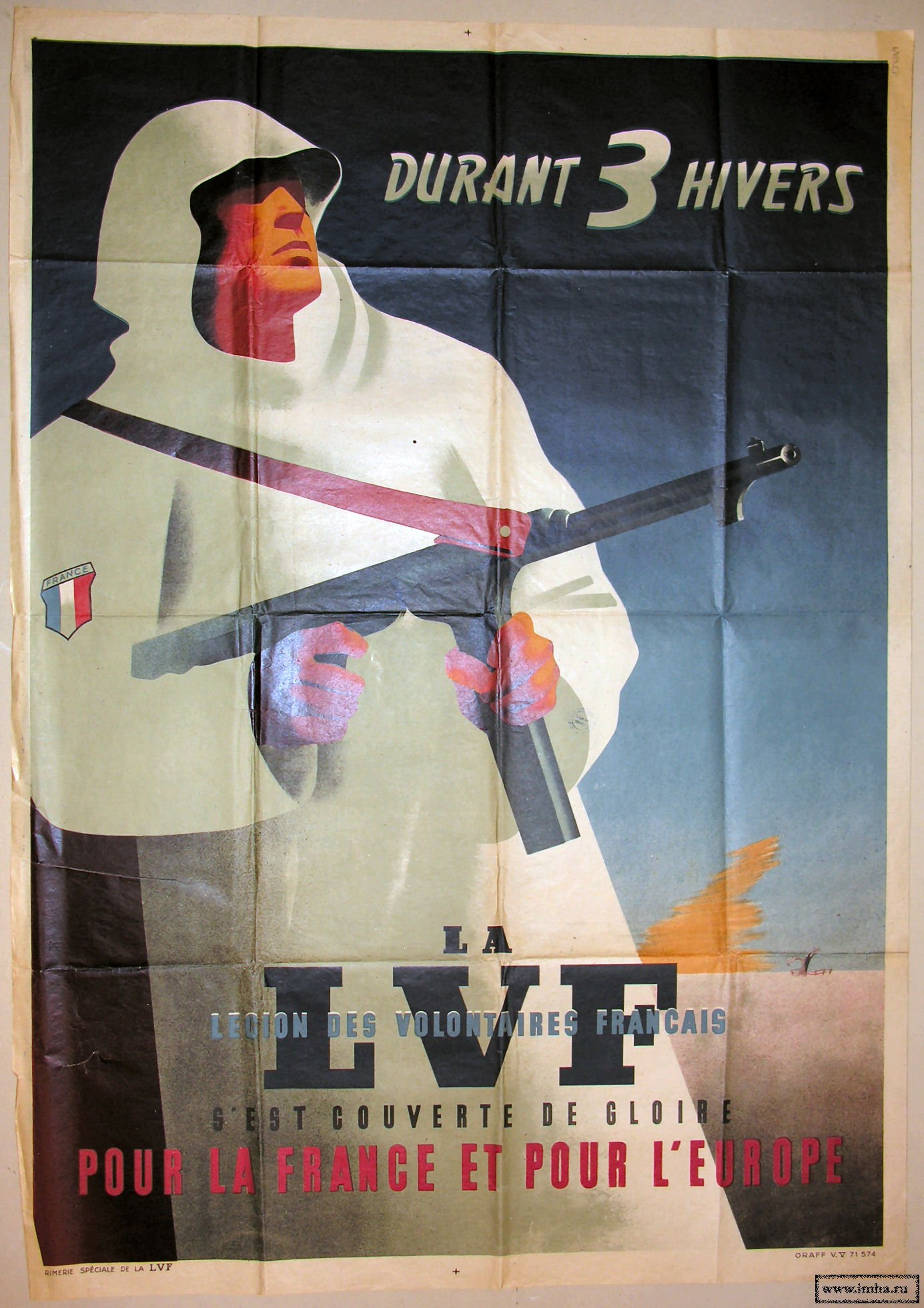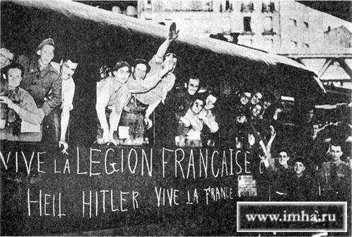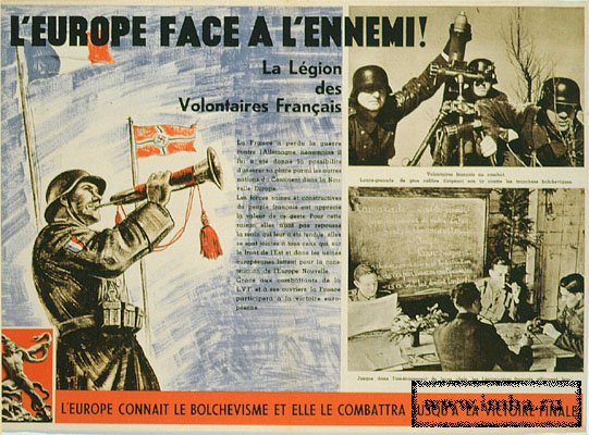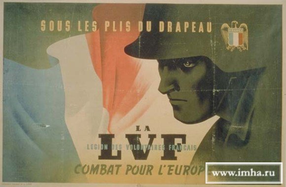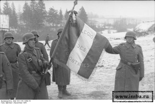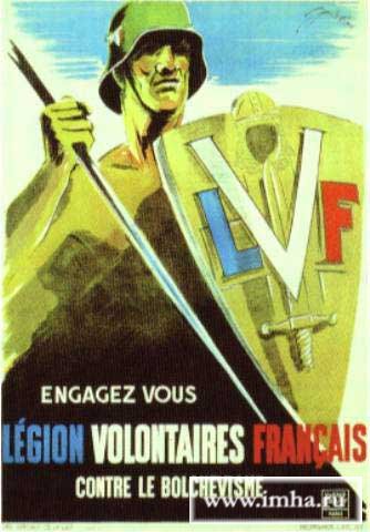 "Легион французских добровольцев против большевизма" получил в составе германского вермахта наименование "638-й пехотный полк (французский)". В ноябре 1941 г. полк, именуемый также"Трехцветным полком" ( франц.: Regiment Tricolore), в составе 7-й пехотной дивизии вермахта, принял участие в боях под Москвой. Автор данных строк, будучи еще студентом, в далеком 1972 г., будучи послан на осенние сельхозработы ("трудовой семестр", а в просторчеии - "на картошку") в деревню Ваулино, впервые услышал от местного старичка-колхозника про то, как в сорок первом у них стояла французская часть немецкой армии и, в том числе, русские. Один из русских офицеров французской части германской армии, по воспоминаниям старичка, квартировал в избе его родителей и часто рассказывал им о своей жизни в дореволюционной России. Впрочем, это так, к слову... Переименованный в начале 1942 г., подобно всем германским пехотным полкам, в "гренадерский" (с целью повышения статуса), полк французских добровольцев принял участие в антипартизанских операциях на территории Белоруссии. Через полгода "Трехцветный полк" получил официальное название "Легиона французских добровольцев" (Legion des Volontaires Francais, LVF). С июня 1943 г. полковника Роже Лабона сменил в должности командира полка полковник Эдгар Пюо. Под его командованием французский легион, в составе германской группы армий "Митте" ("Центр"), летом 1944 г. принял участие в боях на Украине. 25 июня 1944 г. добровольцы французского легиона под командованием майора Бриду, при поддержке пики рующих бомбрдировщиков-"штук" германской Люфтваффе, танков "Тигр" и полицейских частей СС, в течение 48 часов сдержитвали натиск Красной Армии в боях на реке Бобр, подбив более 40 советских танков. В сообщении Советского Информбюро об этих боях было объявлено, что немцам удалось сдержать советское наступление ценой потери "2 французских дивизий". Через месяц на ттерритории Французского государства была объявлена новая запись добровольцев в Легион.![]()