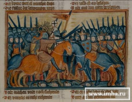 Предводителем небесного воинства выступает рыцарь в багрянице поверх кольчатой брони, верхом на боевом коне, покрытом багряной попоной. Голова рыцаря покрыта горшковидным шлемом с багряным наметом, украшенным – точь-в-точь, как шлем ливонского "магистра» в фильме "Александр Невский»! – парой бычьих рогов и увенчанной крестом царской короной! Кого имел в виду средневековый миниатюрист? Вне всякого сомнения, Того, о Ком святой Тайновидец Апостол Иоанн писал в своем Откровении, и о Ком говорил святой Божий пророк Даниил, предсказавший жестокое время гибели носителей разврата и пришествие дней мира (гл. II): "И восстанет в то время Михаил, князь Великий, стоящий за сынов народа Твоего, и наступит время тяжкое, какого не бывало с тех пор, как существуют люди, до сего времени, но спасутся и в это время из народа Твоего все, которые будут найдены записанными в Книге (вечной жизни – В.А.). Многие очистятся, убелятся и переплавлены будут в искушении, нечестивые же будут поступать нечестиво, и не уразумеет сего никто из нечестивых, а мудрые уразумеют».