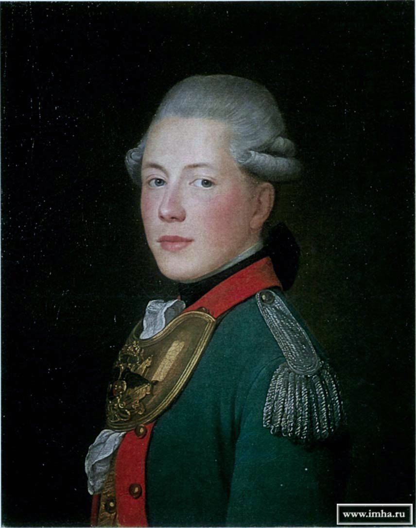 VOILLE JEAN-LOUIS, 1744-1804. Портрет А. П. Вяземского. 1774 г. Вяземский, Андрей Иванович (1750—1807) — с 1773 по 1778 командир Вологодского полка, с 1778 генерал-майор, с 1787 генерал-поручик, с 1796 — назначен Нижегородским и Пензенским генерал-губернатором. По воцарении Павла I в отставке. Сенатор. Отец П. А. Вяземского. Изображен в зеленом мундире офицера армейской пехоты с красным лацканом, с серебряным эполетом на левом плече и нагрудным офицерским знаком. |
