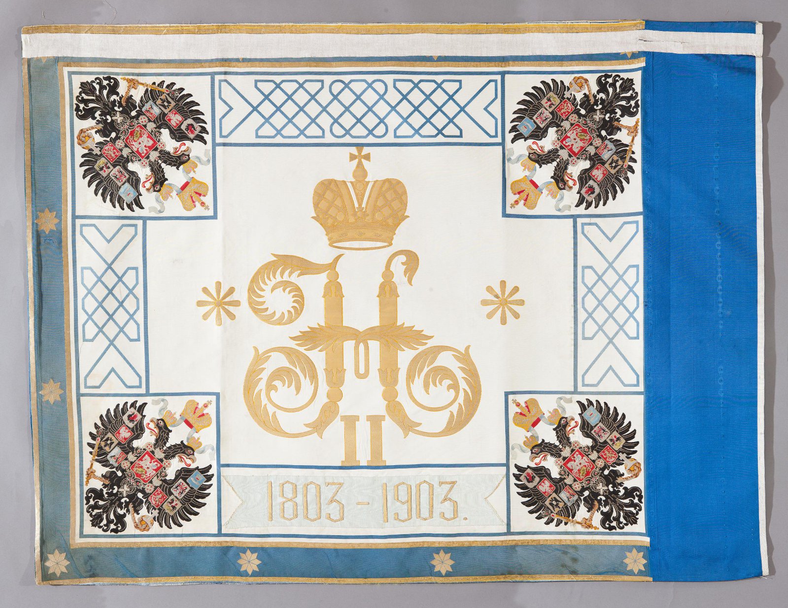 | Знамя 18-го пехотного Вологодского Е.В.Карла I короля румынского полка. 1903. Россия. 108,5х143 см. Шёлк, репс, муар, золотные пряденые нити, цветные шёлковые нити, ткачество. Аверс. ГИМ. |