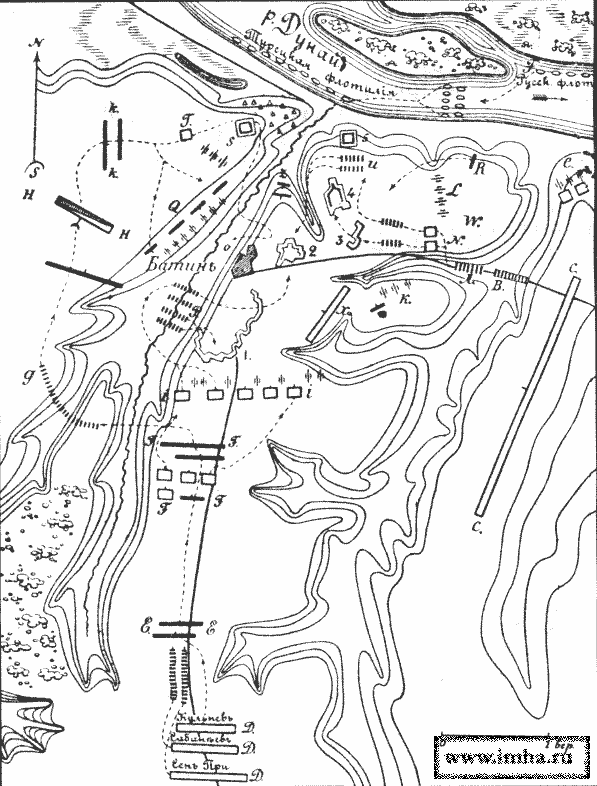 Каменский 1-й не решился атаковать турок и отступил к главным силам. 16 августа мы потеряли 304 человек, турки — около 1.000 человек и 2 знамени. Полученные от пленных сведения о скором прибытии из-под Шумлы войск визиря заставили главнокомандующего выступить к р. Янтре для атаки армии Кушанец-паши. Оставив под Рущуком отряд Генерал-лейтенанта Ланжерона, а у Журжи—Генерал-лейтенанта Засса, главнокомандующий с остальными войсками (около 21.000 чел.) выступил 24 августа из Трестеника к Батину. 25 августа, в 7 ч. утра, наши войска, стоявшие биваком близ Батина, разделенные на 2 части, двинулись для атаки Батинских укреплений: правая, гр. Каменского 1-го (6.300 пехоты и 2.240 кавалерии), состоящая из двух отрядов, должна была напасть с фронта на левый лагерь противника, для чего войска этой части направились по Рущукской дороге и, пройдя около 12 вер., стали на позиции (СС), расположившись на высотах перед крутым оврагом и уперев свой прав. фланг в Дунай; левая, главная часть войск гр. Каменского 2-го (7.450 пехоты и 4.760 кавалерии), разделенная на 3 отряда, должна была атаковать правый фланг турецкой позиции; войска этой части двинулись 3 колоннами в обход правого фланга противника и расположились в три линии (DD), имея в первой отряд Генерала Кульнева, во второй Генерала Сабанеева и в третьей гр. Сен-При. Легкая конница была выслана вперед для связи обеих частей войск. В то же время наша Дунайская флотилия расположилась (F) у левого берега, на высоте правого фланга Каменского 1-го; последний, желая облегчить себе, занятие находившихся за оврагом высот (W), которые могли подвергнуться обстрелу с турецких лодок, предписал судам флотилии атаковать лодки противника.