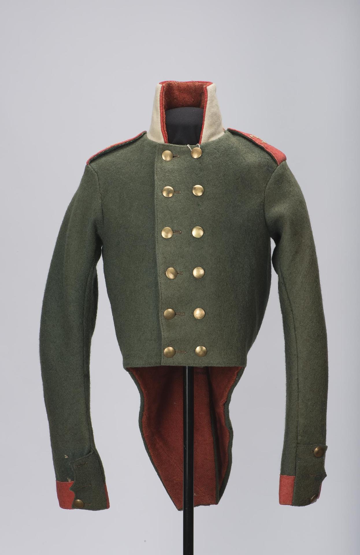 | Мундир рядового 30-го егерского полка. Россия. 1807 г. Сукно, холст. каразея, металл. Размеры: спинка 82 см; талия 92 см. |