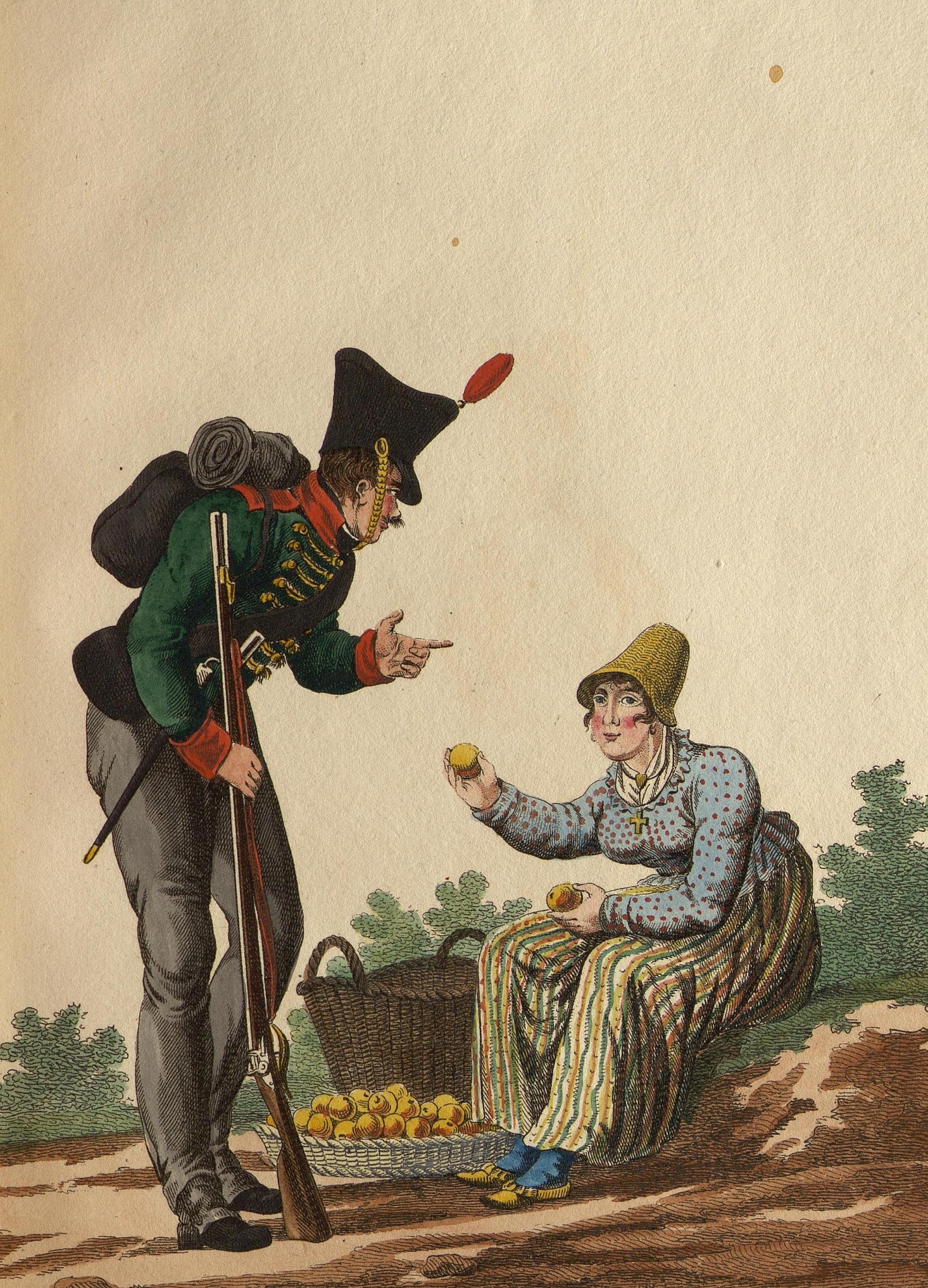 Российский Императорский солдат и продавщица яблок. Автор рисунка: Мартине, Пьер. 1781-1815 (?). Неизвестный гравер, перв. четв. XIX в. Франция, Париж, 1815 г. Издательство "Genty". Альбом раскрашенных гравюр "1-re Suite Costumes militaires Infanterie Russe.". Бумага, резец, офорт, акварель. 27,5х20,2 см. ГЭ. |