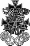 Любопытно, что турецкая Османская Империя – союзница Германии и Австро-Венгрии в Великой войне 1914-1918 годов – ввела для награждения отличившихся на поле брани офицеров и нижних чинов турецкой и союзных с нею армий аналогичную Железному кресту награду - Медаль за отвагу - более известную под неофициальным названием "Железный полумесяц» (в форме красной пятиконечной звезды с наложенным на нее железным полумесяцем рогами вверх и "фетвой» – росписью султана), также считавшуюся весьма почетной. Именно этой турецкой боевой наградой в форме красной пятиконечной звезды был награжден знаменосец "Окровавленного знамени» НСДАП эсэсовец Якоб Гриммингер (что дало Григорию Климову, а вслед за ним - и нашим отечественным любителям "перепевов» климовской "Красной каббалы» повод утверждать, будто "большевики, нацисты и масоны делали одно общее дело»).