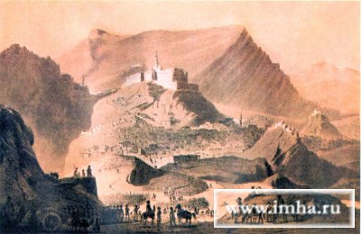Русские войска перед Баязетом в 1854 году. С рисунка, снятого с натуры адъютантом генерал-лейтенанта бар. Врангеля капитаном Чеглоковым. |