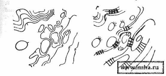 БЕРГШТРИХ разной толщины поясняют крутизну скатов, когда рельеф глазомерно набрасывают отрывками горизонталей, которые предстоит, затем вычертить соответствующей толщины штрихами.