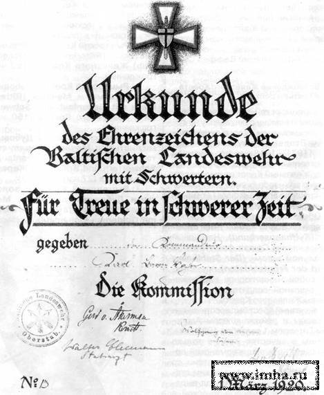 Эмблема: черная манжетная лента с надписью "Добровольческий корпус Баренфельд 1919».![]()